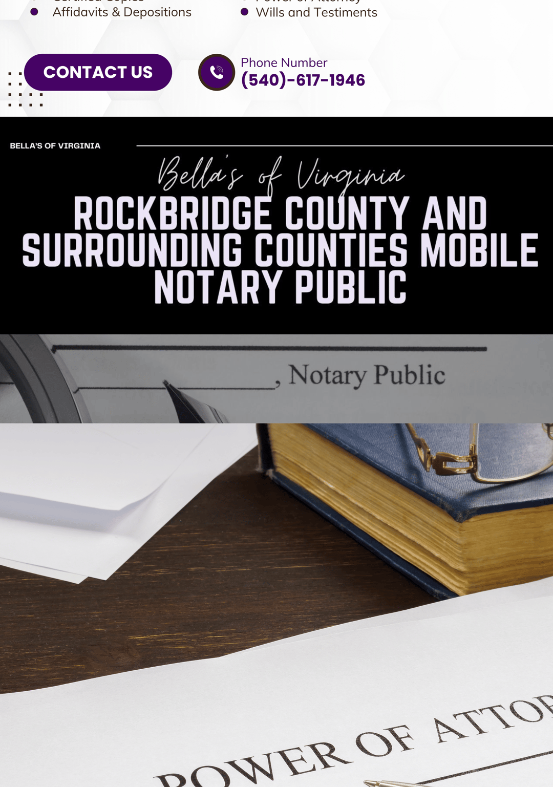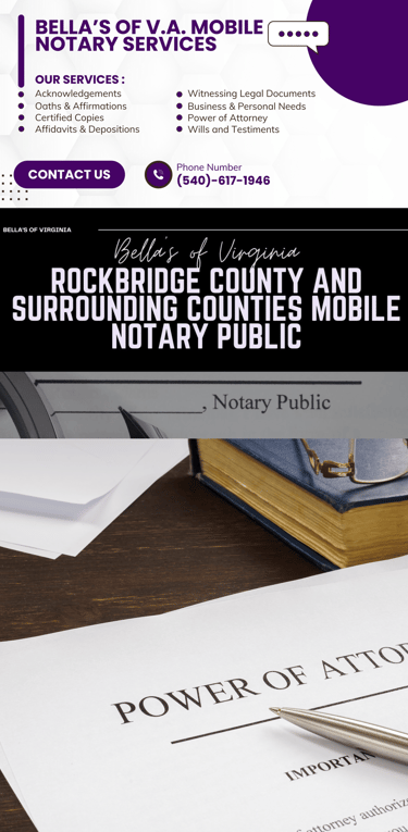 At Bella’s of Virginia Mobile Notary Public, my vision is to become the most trusted and accessible mobile notary service in Rockbridge County and surrounding areas. I strive to set the standard for convenience, professionalism, and care by bringing notarization services directly to our community. Our goal is to build lasting relationships through integrity, reliability, and a commitment to making every signing a smooth and stress-free experience.